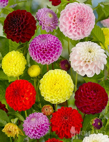 Ball dahlias are a three dimensional treasure of the summer garden. This Ball Mixture of dahlias have round ball shaped blooms with their petals displayed in a perfect spiral. Ball dahlias are similar to pom pon dahlias, however ball dahlias have slightly larger blooms. This mix is a very showy addition to your garden, as well as your cut flower arrangements.