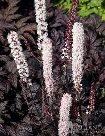 Chocoholic Snakeroot also known as bugbane is a snakeroot with deep burgundy deeply divided foliage. We adore the foliage for the new dimension of color it will add to your part sun to shade locations in the garden. In late summer the blooms which have a light butterscotch fragrance appear with spires of light pink to white blooms. Looks stunning when planted with plants that have golden blooms and or/ foliage.
