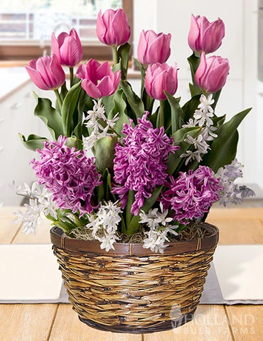 Fancy, frilly and fragrant, all blooming in a cute basket! Fancy & Frilly Potted Bulb Garden is a splendid mix of purple, pink and white blooms. A sunny location is necessary for optimal blooms and growth from this bulb garden. Place the bulb garden in a sunny location that receives at least 5 hours of sun per day.