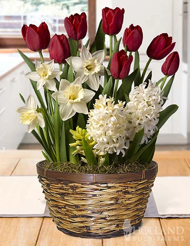 Create a beautiful setting this holiday season with the Holiday Home Potted Bulb Garden. Send the love of your home to your family and friends with the gift of a potted bulb garden. Holiday Home Potted Bulb Garden will bloom with red tulips, white daffodils and fragrant white hyacinths.
