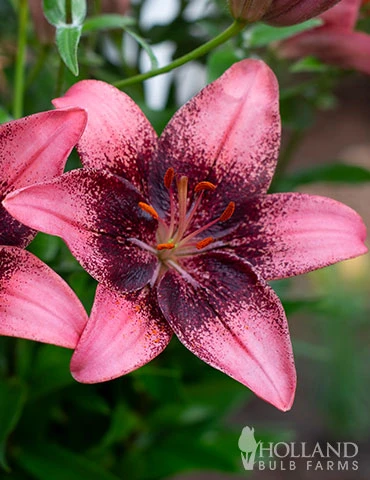 One of the most unique Asiatic lilies available, the Purple Eye Asiatic Lily is a beautiful pink lily with a deep purple center. Asiatic lilies have upright facing blooms and bloom mid-summer. Within a few weeks after blooming, Asiatic lilies do go dormant. We recommend planting late summer blooming plants around Asiatic lilies to increase seasonal interest.