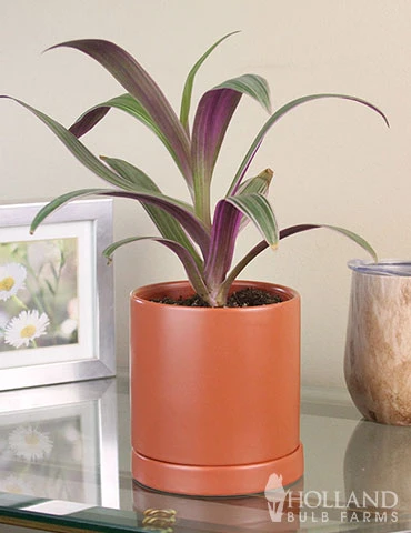 The Rhoeo Tricolor plant is easy to grow and adds color to any indoor space! The sword-like leaves have white and green variegation on the topside with a showy, purple on the underside. Also known as, Boat Lily, Moses-in-the-Cradle and Oyster Plant, this houseplant not only has beautiful foliage, it also yields small, white flowers Spring into Fall! Keep this plant away from direct light and keep the soil slightly moist, checking it daily to make sure it doesn’t dry out completely.