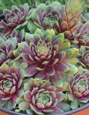 Hens & Chicks are one of the most unique succulents to use as a border plant or in a container. This plant will form a large rosettes, the “hens,” of sharply pointed, silvery green foliage that is flushed with rosy/red colors at the base. This color may vary from season to season, becoming brighter in cooler temperatures. The large rosettes will grow small rosettes the “chicks” that can easily be divided and planted elsewhere. Hens & Chicks are perfect in a dry location, a rock garden or in a container.