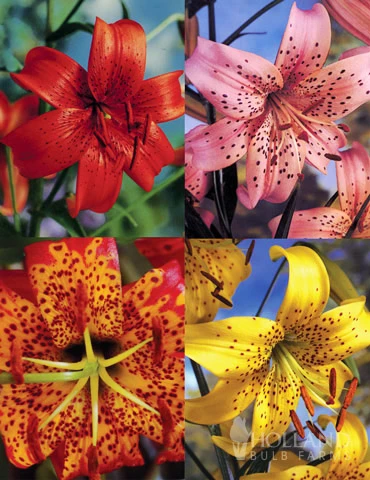 Plant these old fashioned favorites in your garden this year. Tall and exquisite these easy to grow, hardy lilies will make a definite impact in your borders this year! This collection contains 4 different types of tiger lilies, what a great way to add these to your garden this year!
